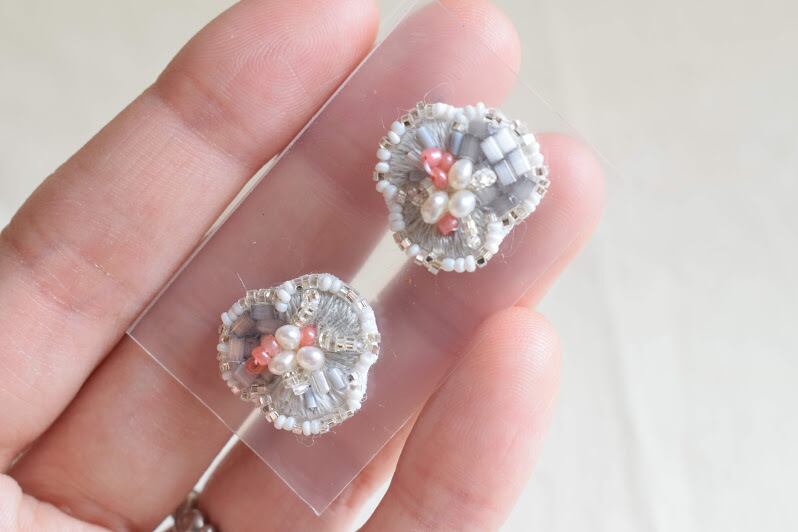 半透明なグレービーズに、ライトグレーの糸を合わせ、落ち着きと華やかさのあるお花に仕上げました。