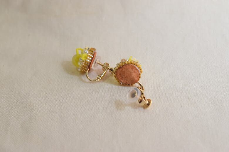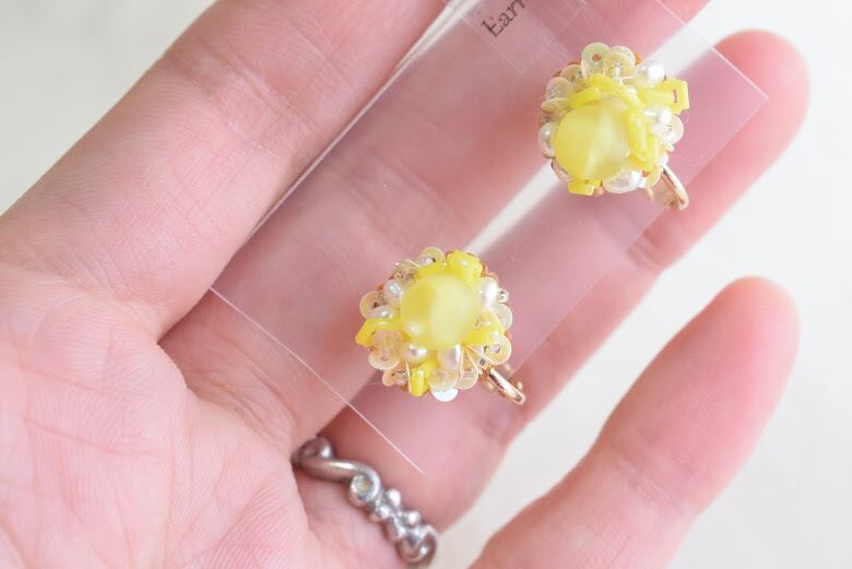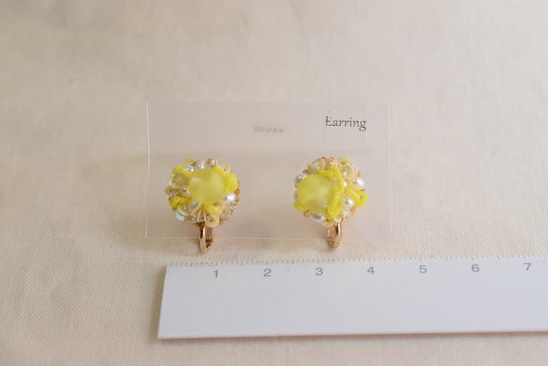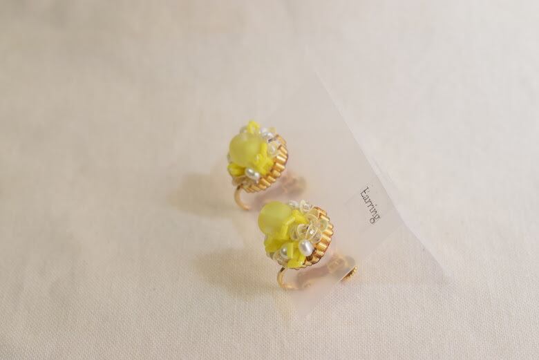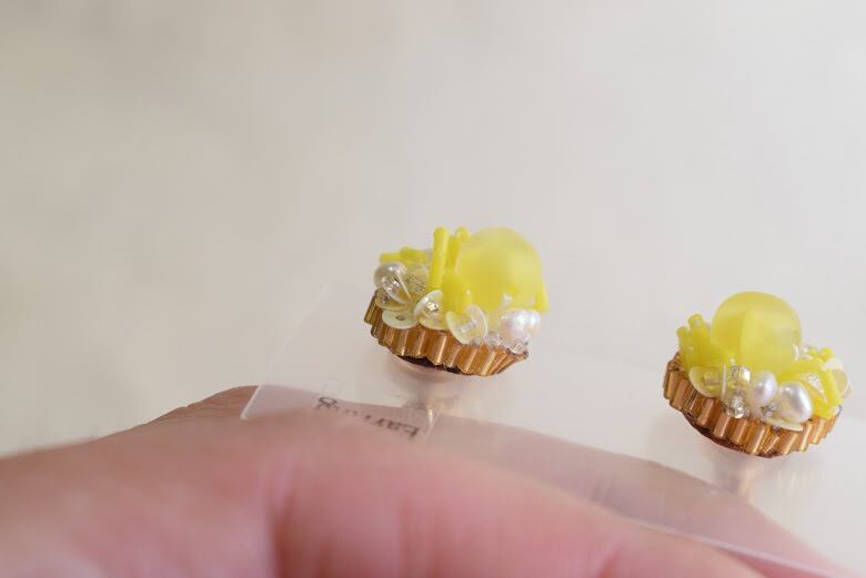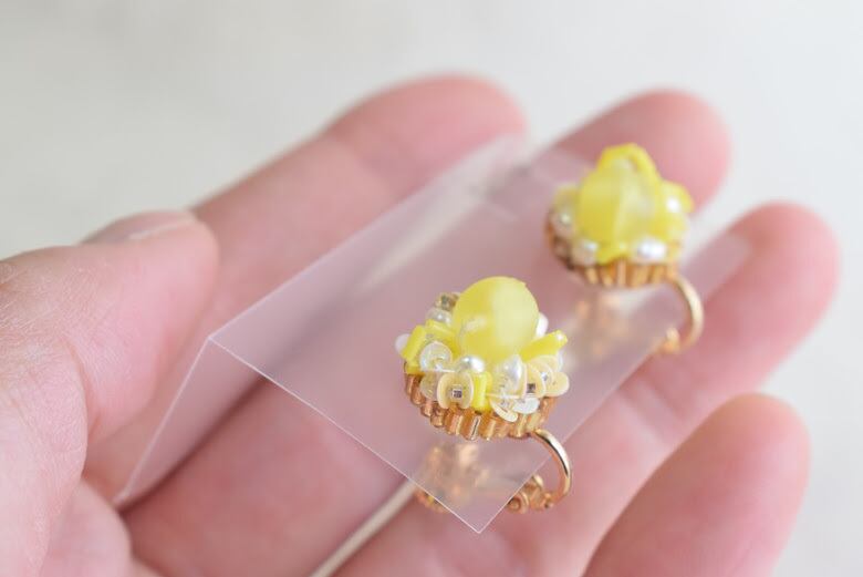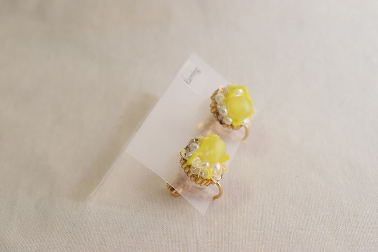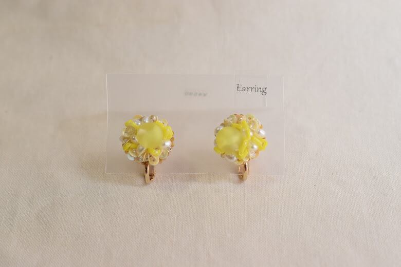 半マットなレモンイエローのビーズをメインに軽やかなイエローでまとめ、サイドのゴールドビーズで高級感を感じさせる色合いに仕上げました。
