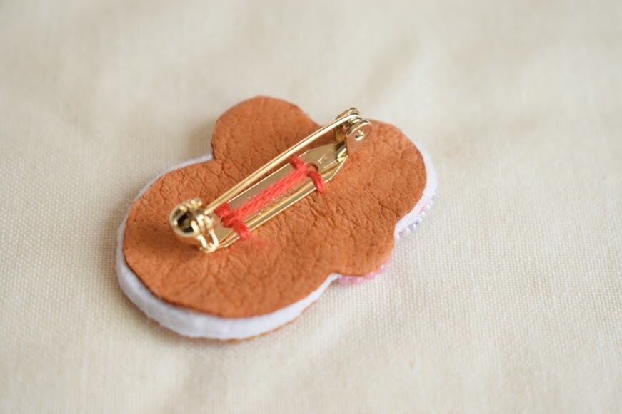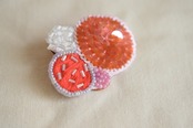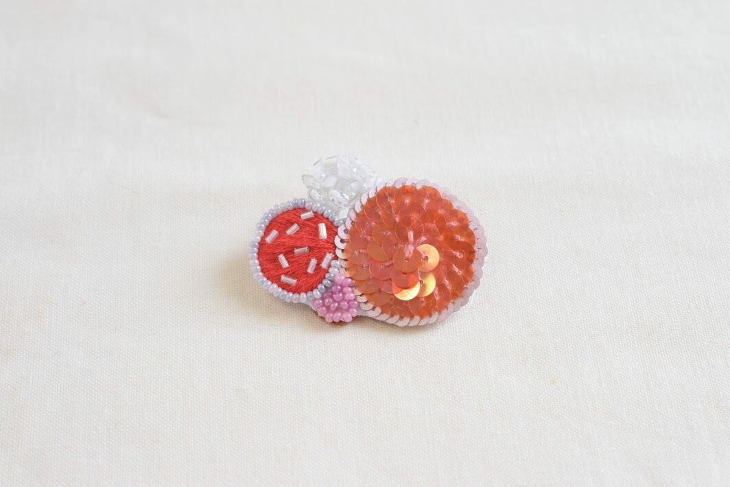 スカーレットカラーと白色の組み合わせがパッと目をひくブローチ。