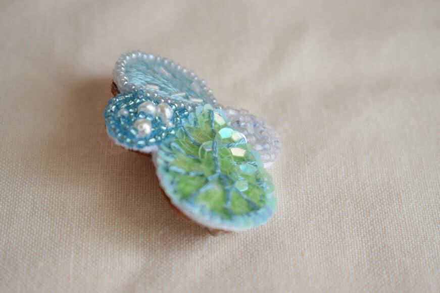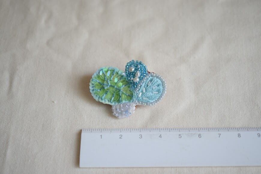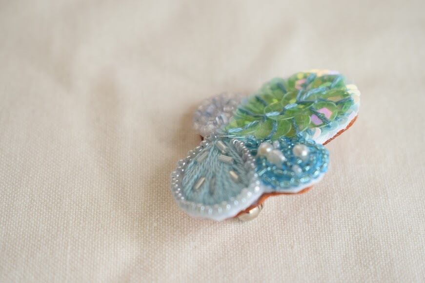 ヴィンテージスパンコールを一枚一枚、ヴィンテージビーズを一粒一粒縫い付けたブローチ。ミントグリーン~水色の組み合わせが爽やかなブローチ。