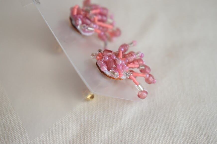 揺れる部分も一粒ずつ針に通して編むように縫っています。
