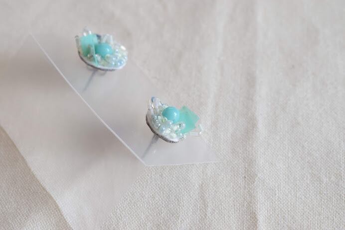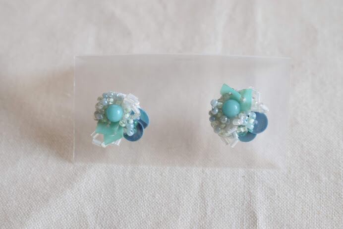 アクアブルー~ホワイトの組み合わせでヴィンテージビーズとスパンコールを縫い付けた耳飾りです。